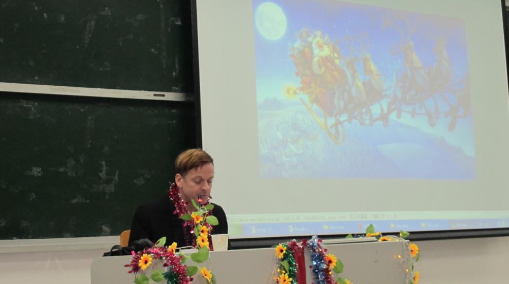 老师为这次讲座做了充分的准备,他首先向同学们介绍了圣诞节的起源。接下来,Jonathan老师主要和同学们分享了圣诞节中的诸多传统和它们的发展历程。时而风趣幽默,时而侃侃而谈,同学们积极呼应,现场不断爆发出忍俊不禁的笑声。
