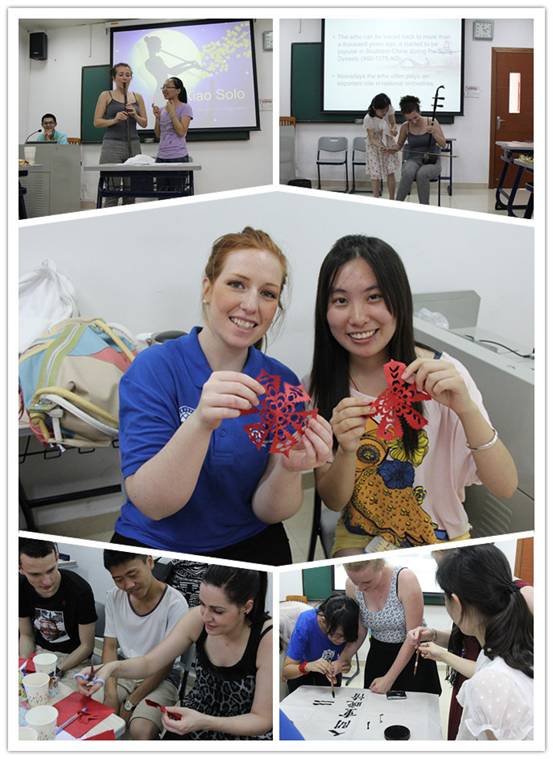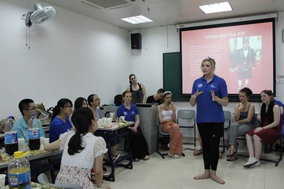 下午2点整,GCU大学的员工与公司员工在第七教学楼进行了Experience Sharing活动。商英学子多才多艺,为远道而来的伙伴表演了一系列中国传统文化活动,包括茶道展示、二胡、箫演奏,太极拳、书法还有剪纸等。现场气氛十分热烈,GCU的员工对中国文化表现出极大的兴趣,特别是书法环节和剪纸环节,他们迫不及待加入尝试。作为交流的一部分,GCU的同学也给公司学子带来精彩的展示,他们借由图文并茂的PPT介绍了他们的生活和文化,让公司学子对GCU大学、格拉斯哥、苏格兰和英国都有了更深刻的了解。活动在愉快的气氛中结束。