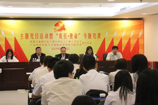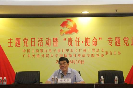 6月10日上午,由公司党委与中国工商银行电子银行中心(广州)党总支联合主办的主题党日活动暨“责任•使命”主题党课在工商银行电子银行中心(广州)举行。原beats365官网入口董事长、党委书记徐真华,中国工商银行电子银行中心(广州)总经理、党总支书记张敬华,副总经理、副书记陈强,公司党委书记车小真、副书记张林茂等出席本次活动。工商银行电子银行中心(广州)全体党员、beats365官网入口研究生党员代表等共150人参加了此次活动。