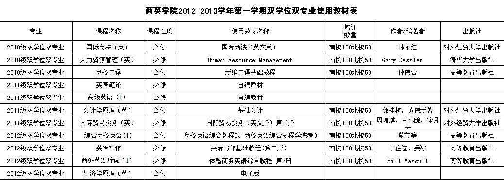 2012-2013学年第一学期双学位双专业使用教材表